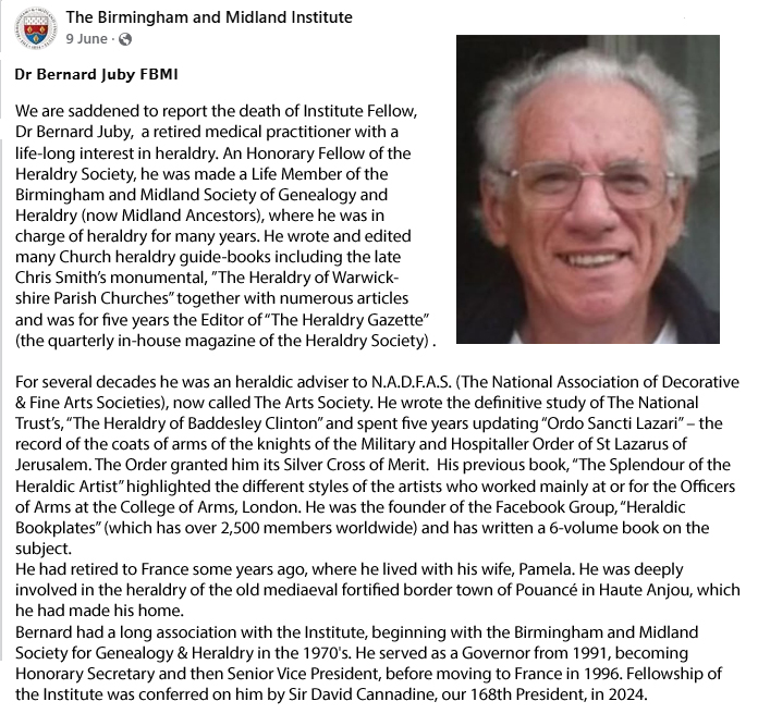 A further loss in June is that of Dr Bernard Arthur Juby (see Obit), retired